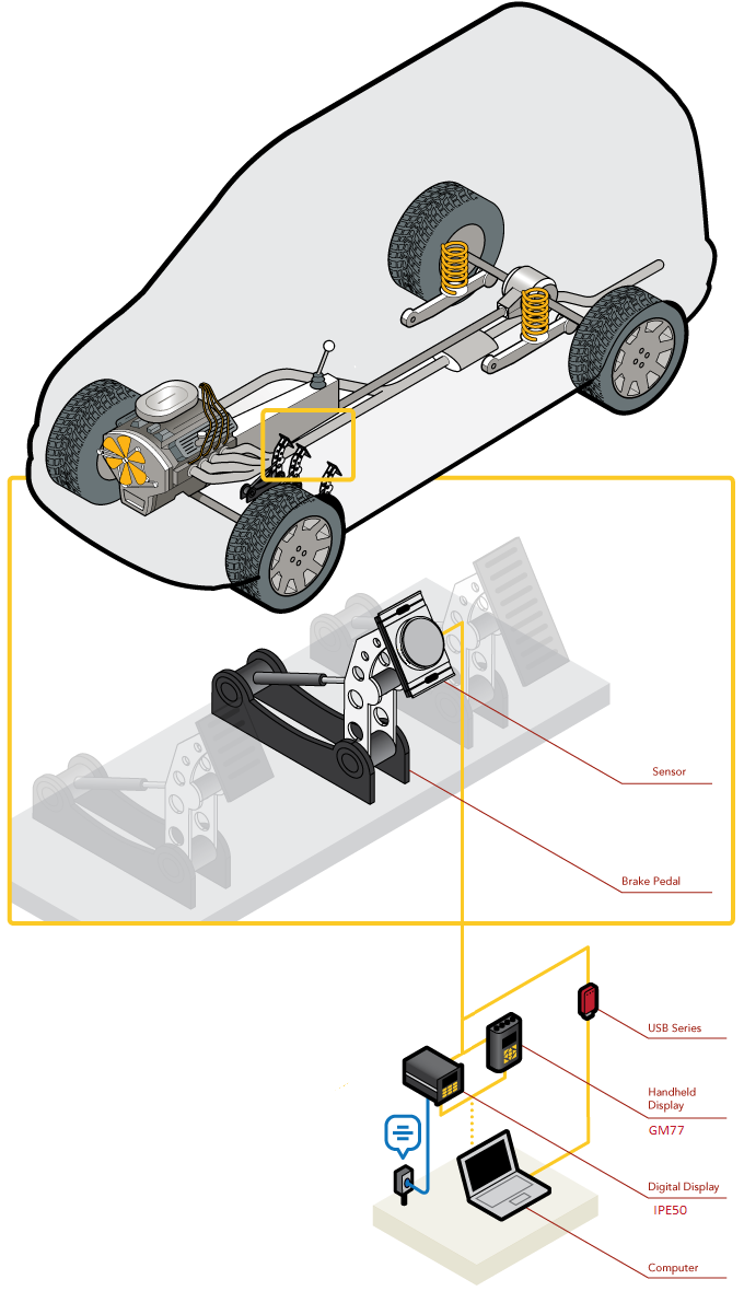 - Mounted to the top of the automobile’s brake pedal, this pedal force sensor accurately measures and records applied forces during scheduled tests. These tests are carried out to validate the integrity of the brake system.