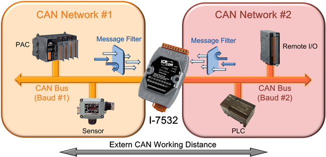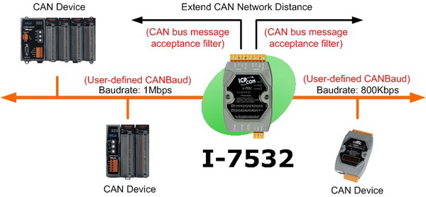The I-7532 is a CAN bus bridge that can be used to integrate two CAN networks even they implement different CAN baud rate. Compared with the I-7531, the I-7532 offers more than 3 useful features. First, the transmission distance limitation of the CAN bus system on each side of the I-7532 is independent, which means the total CAN network distance can be extended. Second, when some errors (e.g. bit error) happened on one CAN port of the I-7532, the other CAN port of the I-7532 will not be affected and can still work correctly. Last, the baud rate and CAN message filter configuration of these two CAN ports on the I-7532 is able to be tuned following users’ applications. These features mean that users can design their applications more flexible and efficient.